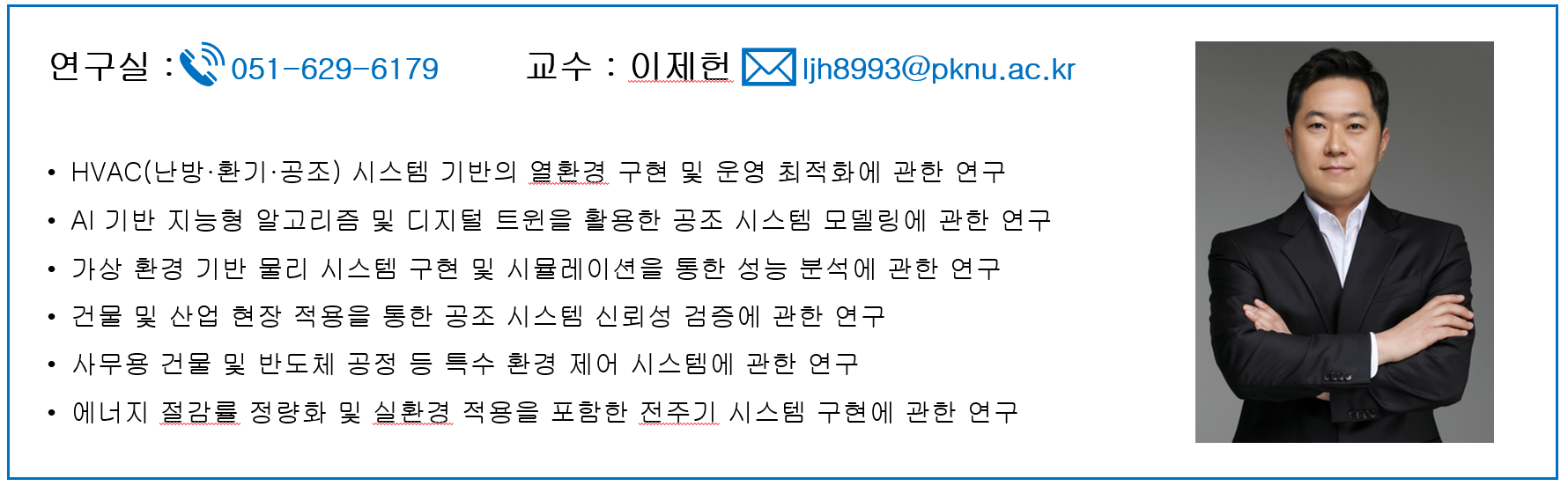 | 인간의 쾌적감에 영향을 미치는 요인들은 물리·화학적인 요인, 환경적인 요인, 개인적인 요인, 생활 및 문화적인 요인으로 나눌 수 있다. 쾌적감 증대시키기 위한 쾌적기술은 주변환경의 온도 및 습도, 공기질(AIR QUALITY) 등과 같은 물리·화학적 요소들을 직접적으로 조절하는 기술뿐만 아니라 개인, 생활, 문화적 요인 등을 함께 고려해야 한다. 그러므로 친환경공조시스템을 개발하기 위해서는 온열환경의 환경측 4요소인 공기온도, 상대습도, 기류속도, 복사온도와 인체측 2요소인 착의량, 대사량을 에너지 절약적인 측면과 쾌적감의 측면에서 제어 및 평가하는 기술이 필요하다. 따라서 본 연구실에서는 상기의 기술을 활용하여 친환경 공조시스템을 연구 개발하고자 한다. |