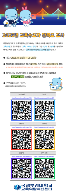 [2025년 교육수요자 만족도 조사 참여] 많은 참여바랍니다! ▶졸업생 https://www.pknu.ac.kr/main/403 ▶학부모 https://www.pknu.ac.kr/main/404 ▶산업체 https://www.pknu.ac.kr/main/405 ▶지역사회 https://www.pknu.ac.kr/main/441