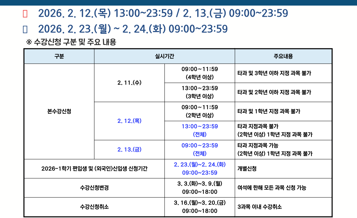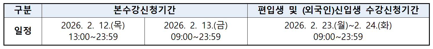 | 첨부파일 | 1. 신입생 수강신청 메뉴얼(2026-1).pdf 2. LMS 사용 설명서.pdf 3. 실시간강의 수강방법.pdf 4. 혁신수업 안내자료(2026).pdf | ||