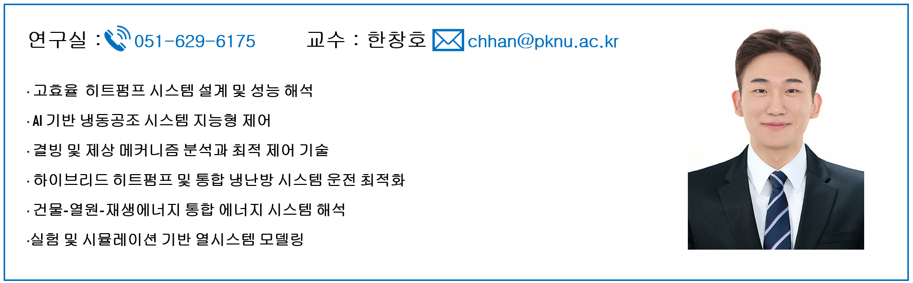 본 연구실은 고효율 히트펌프 및 통합 에너지 시스템의 설계, 해석 및 지능형 제어 기술을 연구한다. 열역학 기반 시스템 모델링, 실험 검증, 그리고 AI 기반 최적화 기법을 융합하여 냉동공조 시스템의 성능 향상, 에너지 절감, 탄소 저감을 목표로 한다. 특히, 히트펌프의 장기 성능 해석, 결빙·제상 제어, 다중 증발기 시스템의 압력 제어, 건물 에너지 통합 운전 전략 등에 대한 연구를 수행하며, 산업체와의 협력을 통해 실용적이고 확장 가능한 기술 개발을 지향한다. |
