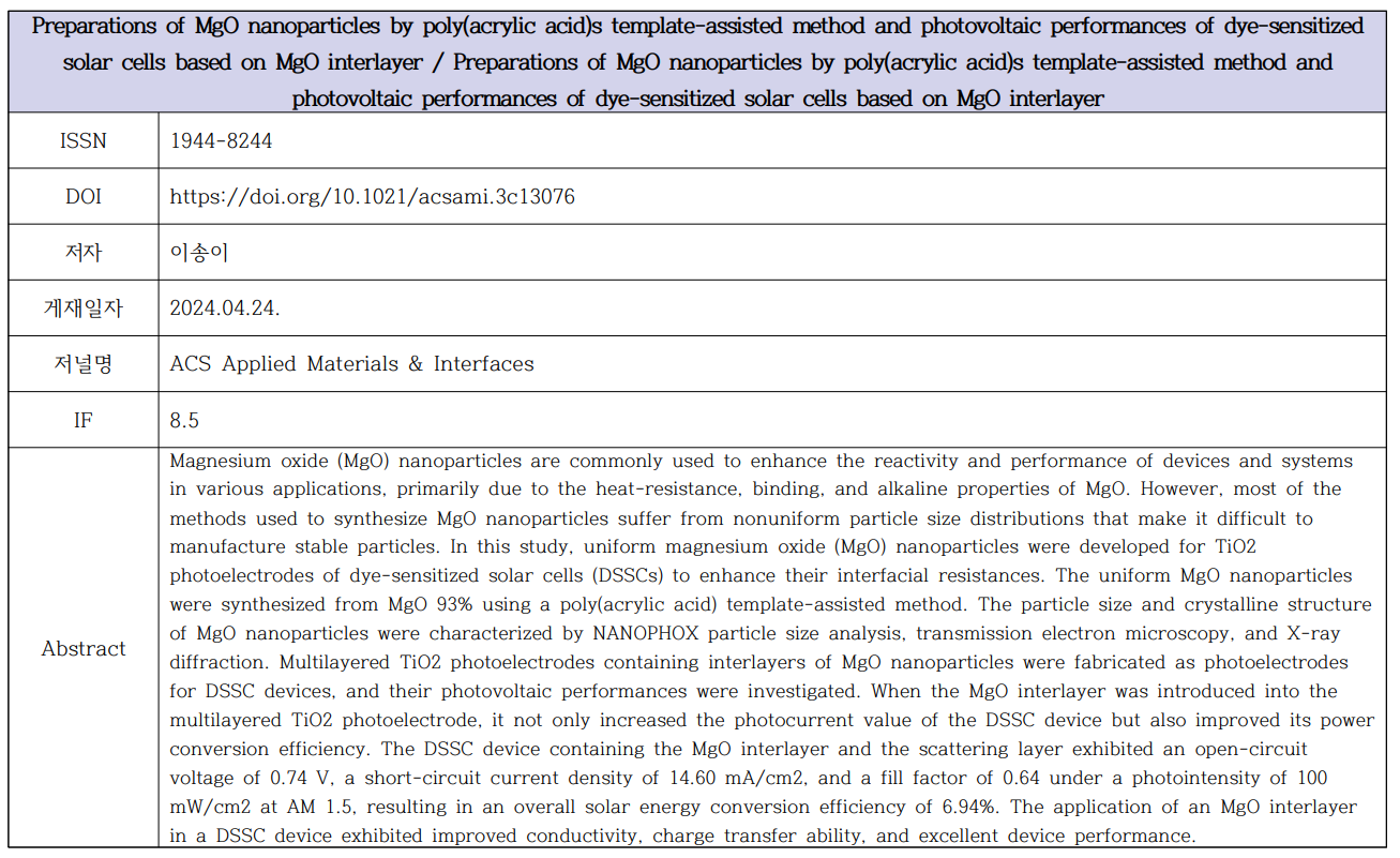 (이송이) Preparations of MgO nanoparticles by poly(acrylic acid)s template-assisted method and photovoltaic performances of dye-sensitized solar cells based on MgO interlayer