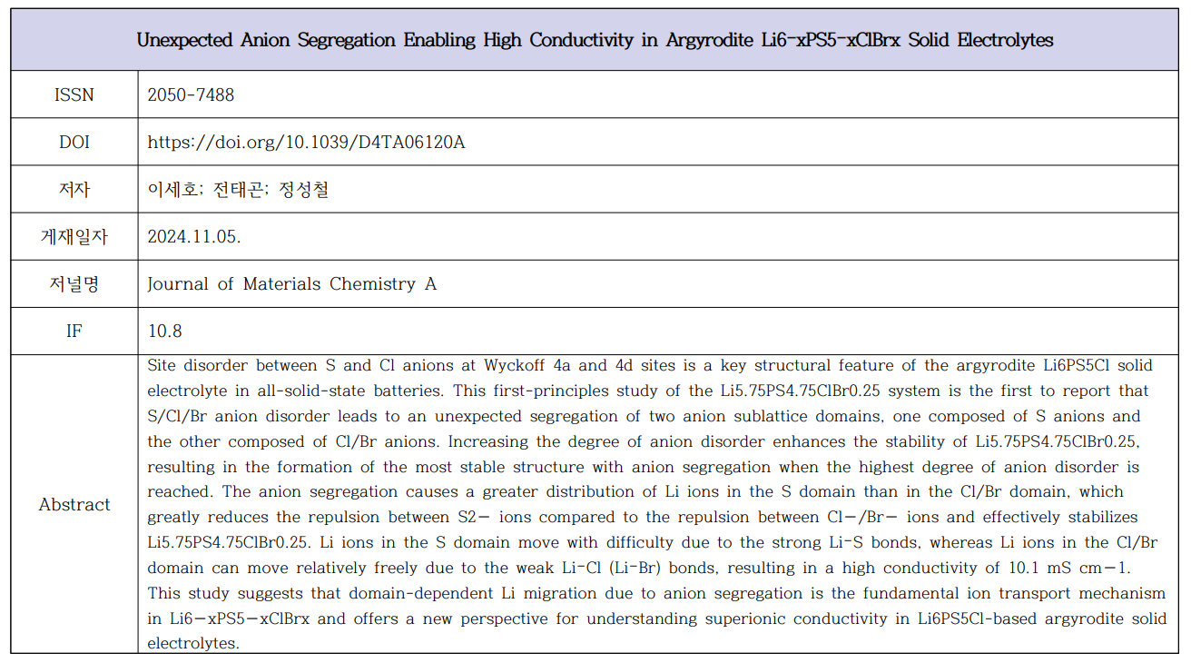 (이세호; 정성철) Unexpected Anion Segregation Enabling High Conductivity in Argyrodite Li6?xPS5?xClBrx Solid Electrolytes