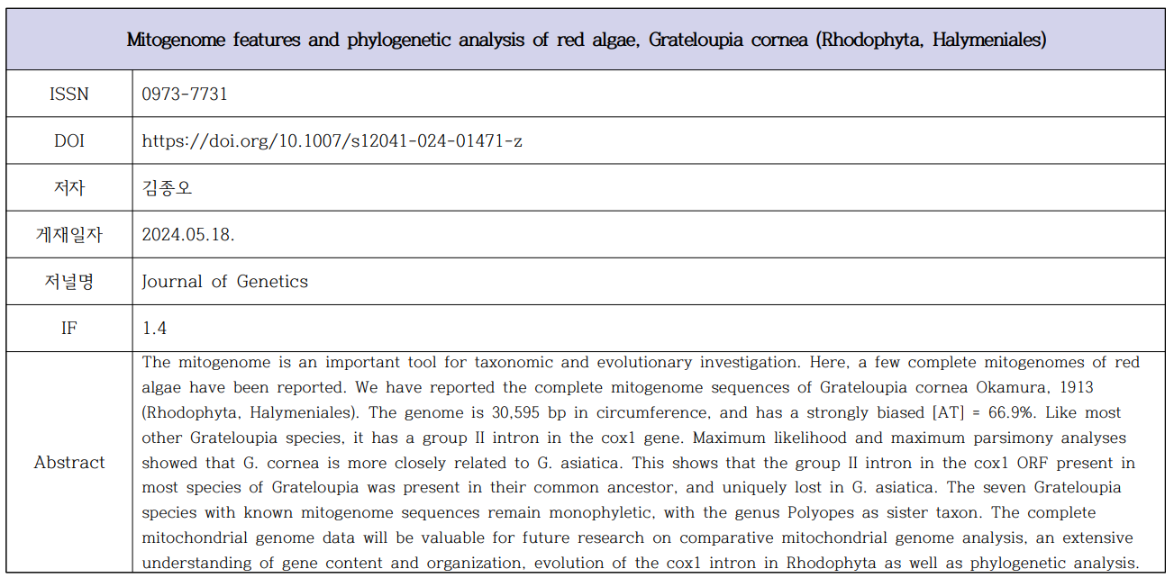 | (김종오) Mitogenome features and phylogenetic analysis of red algae, Grateloupia cornea (Rhodophyta, Halymeniales) | |||