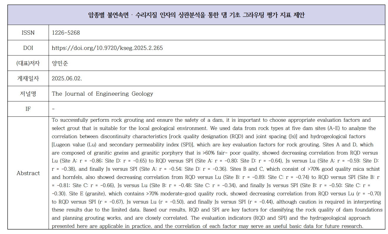 (양민준) 암종별 불연속면 ? 수리지질 인자의 상관분석을 통한 댐 기초 그라우팅 평가 지표 제안