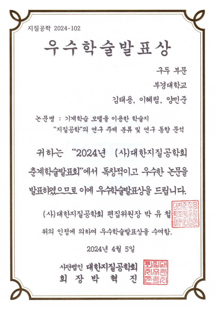 (양민준) 사단법인 대한지질공학회_우수학술발표상(김태용; 이혜림)