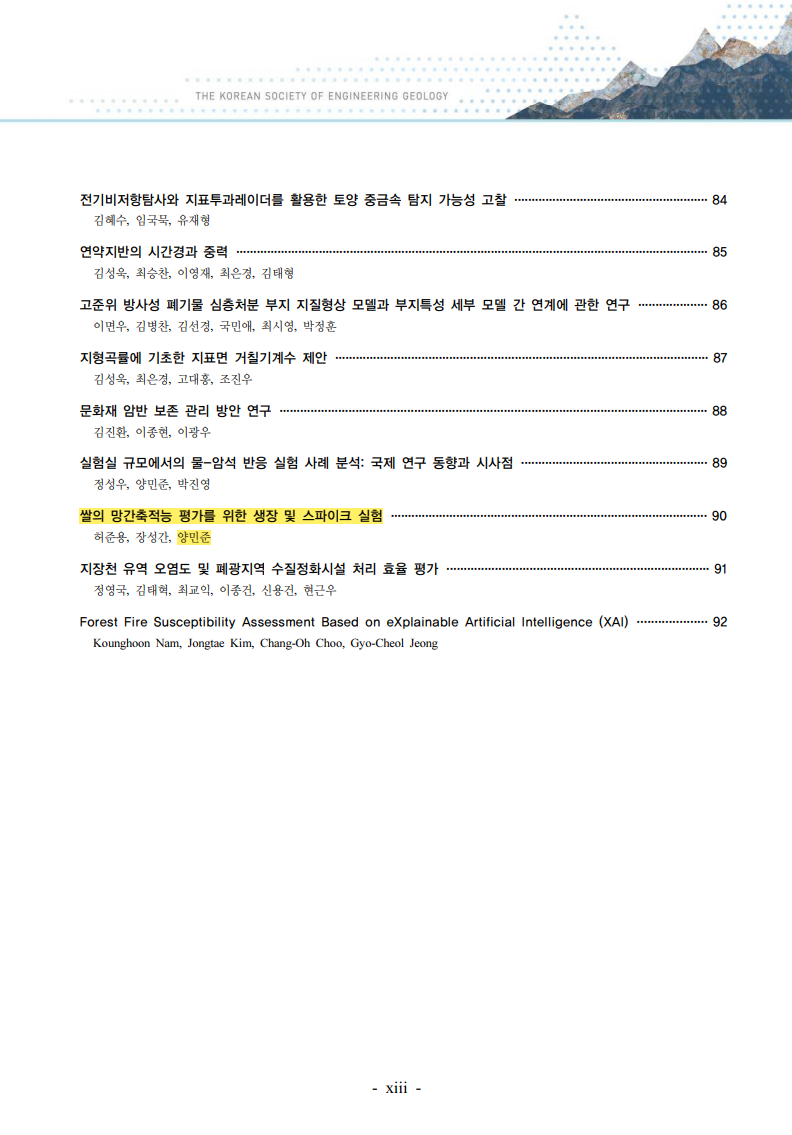 | 이전 | (양민준) 2024 (사)대한지질공학회 정기총회 및 춘계학술대회_기계학습 모델을 이용한 학술지“지질공학”의 연구 주제 분류 및 연구 동향 분석 |