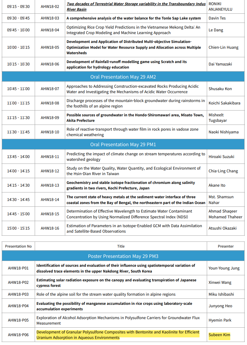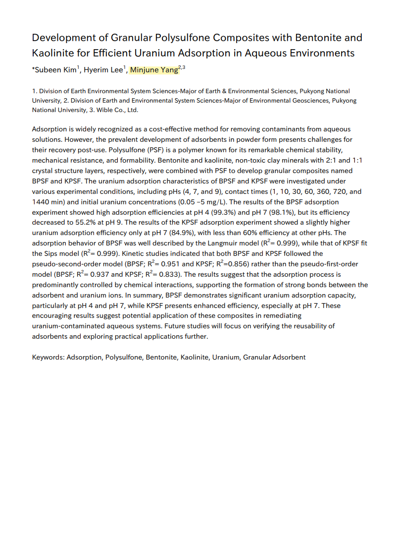 (양민준) Japan Geoscience Union Meeting 2024_Development of Granular Polysulfone Composites with Bentonite and Kaolinite for Efficient Uranium Adsorption in Aqueous Environments