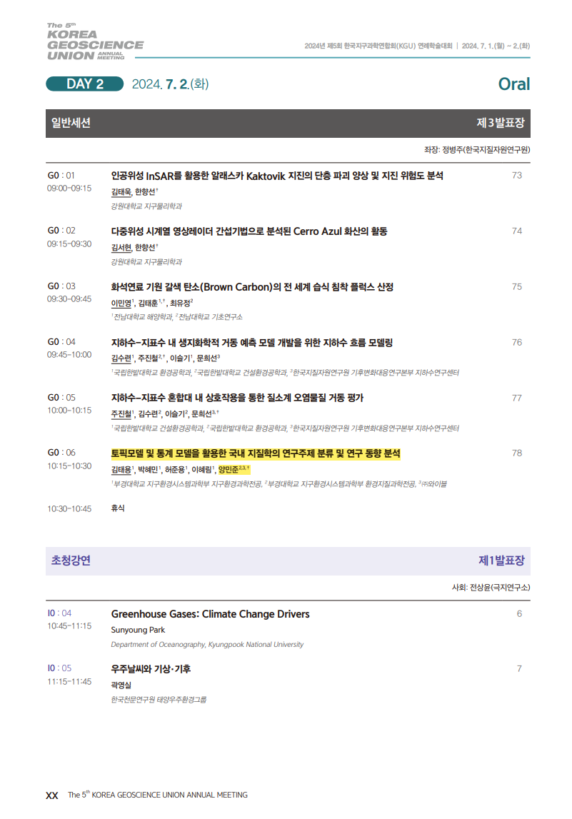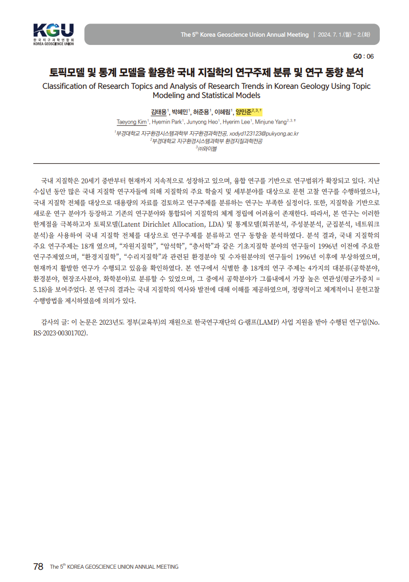 (양민준) 2024년 제5회 한국지구과학연합회(KGU) 연례학술대회_토픽모델 및 통계 모델을 활용한 국내 지질학의 연구주제 분류 및 연구 동향 분석
