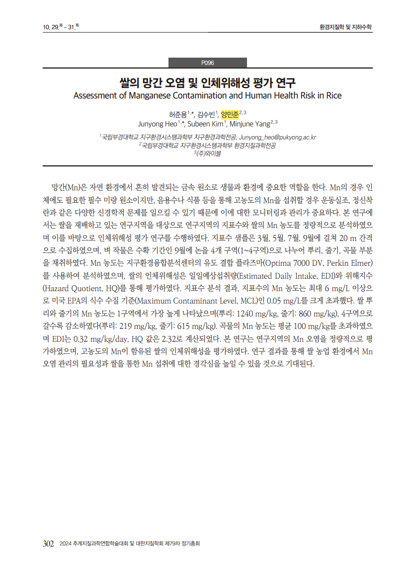 (양민준) 2024 추계지질과학연합학술대회 및 대한지질학회 제79차 정기총회_쌀의 망간 오염 및 인체위해성 평가 연구