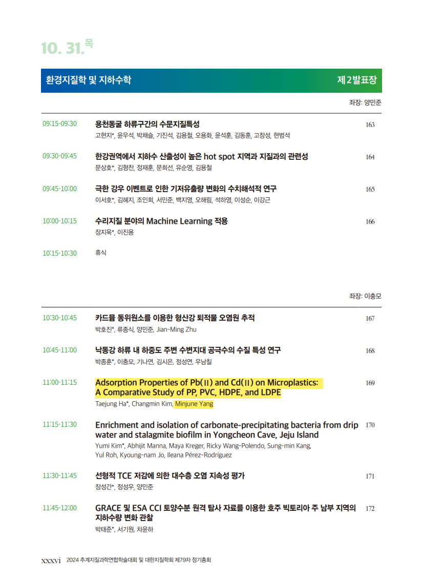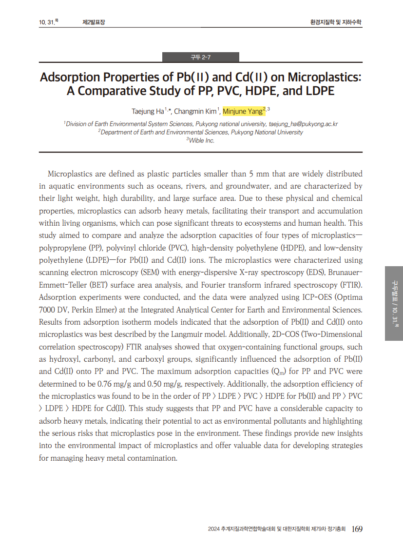 | (양민준) 2024 추계지질과학연합학술대회 및 대한지질학회 제79차 정기총회_Adsorption properties of Pb(Ⅱ) and Cd(Ⅱ) on microplastics: A comparative study of PP, PVC, HDPE, and LDPE | |||