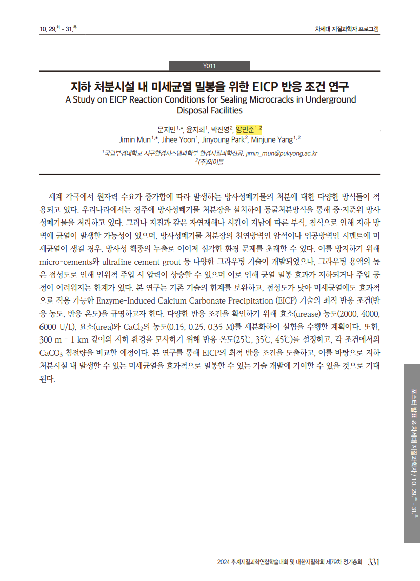 | (양민준) 2024 추계지질과학연합학술대회 및 대한지질학회 제79차 정기총회_지하 처분시설 내 미세균열 밀봉을 위한 EICP 반응 조건 연구 | |||