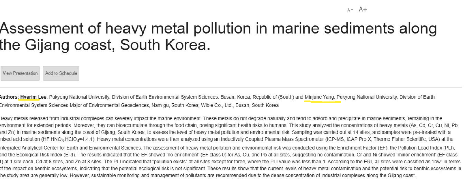 (양민준) 2024 AGU_Assessment of heavy metal pollution in marine sediments along the Gijang coast, South Korea