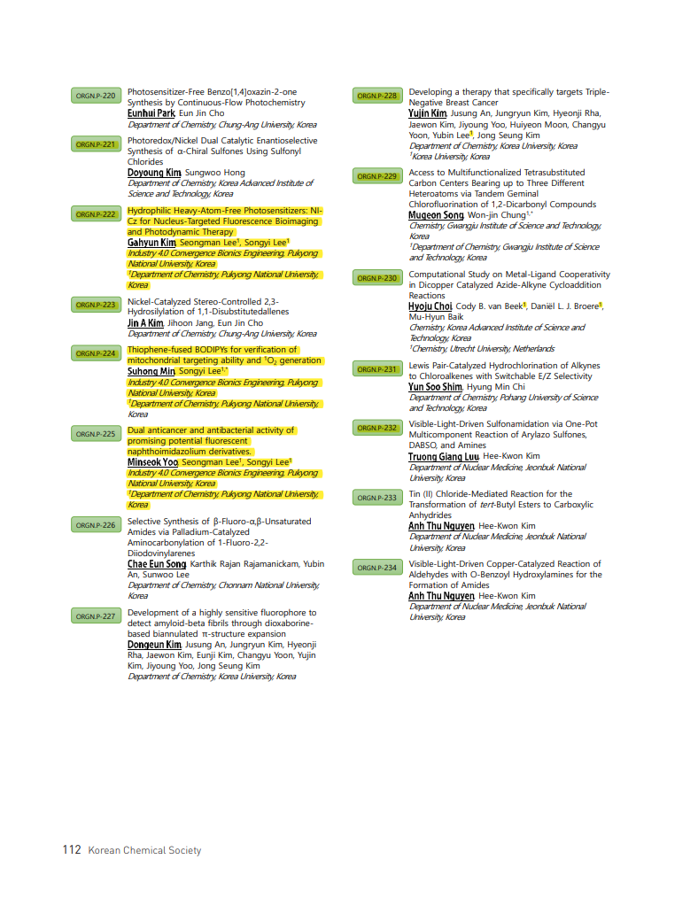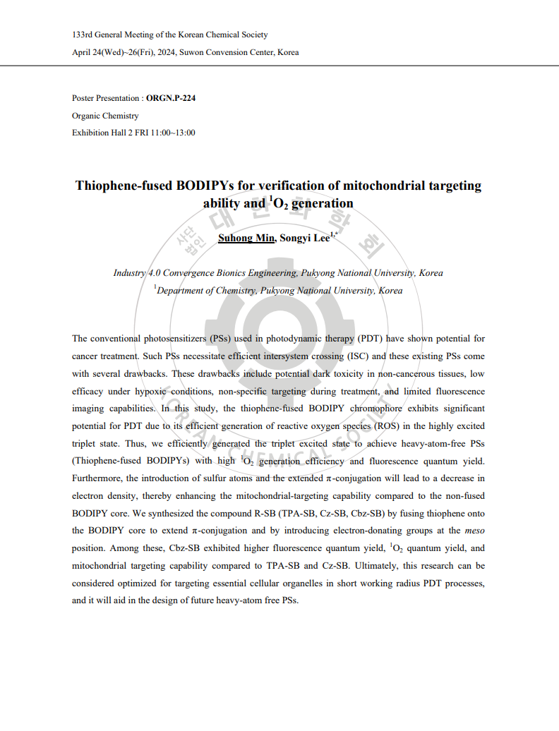 (이송이) 대한화학회 제134회 학술발표회_Thiophene-fused BODIPYs for verification of mitochondrial targeting ability and 1O2 generation