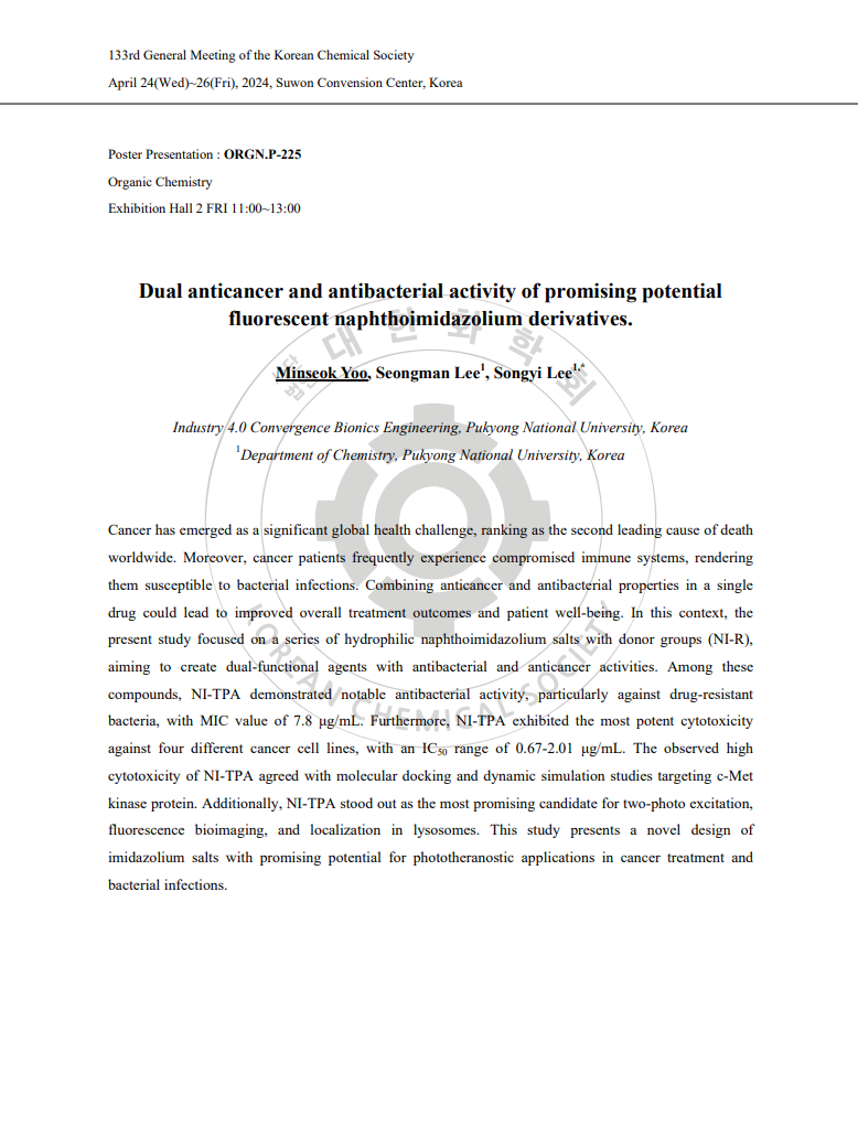 (이송이) 대한화학회 제135회 학술발표회_Dual anticancer and antibacterial activity of promising potential fluorescent naphthoimidazolium derivatives