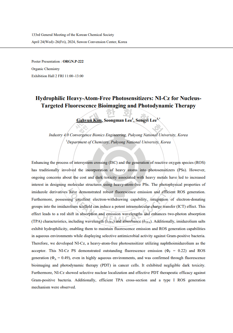 (이송이) 대한화학회 제136회 학술발표회_Hydrophilic Heavy-Atom-Free Photosensitizers: NI-Cz for Nucleus- Targeted Fluorescence Bioimaging and Photodynamic Therapy