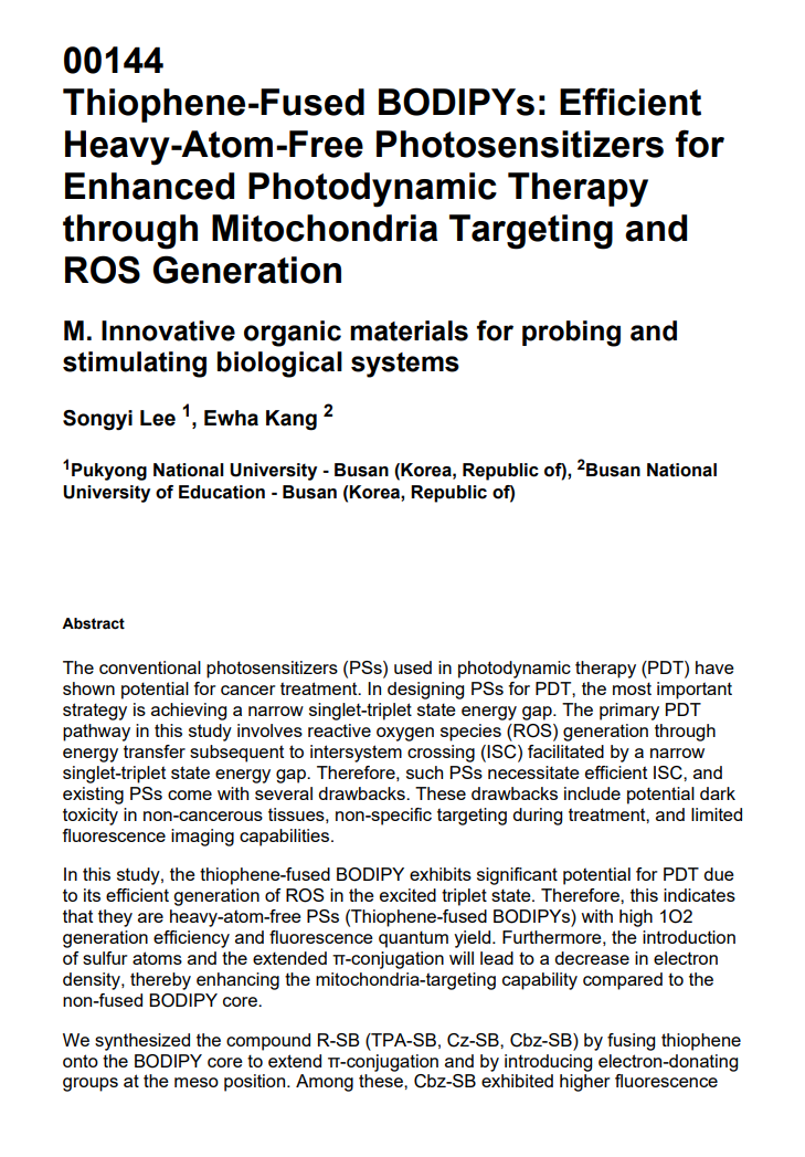 (이송이) E-MRS 2024 Fall Meeting_Thiophene-Fused BODIPYs: Efficient Heavy-Atom-Free Photosensitizers for Enhanced Photodynamic Therapy through Mitochondria Targeting and ROS Generation
