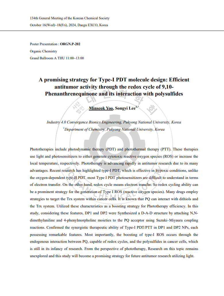 (이송이) 대한화학회 제136회 학술발표회_A promising strategy for Type-I PDT molecule design: Efficient antitumor activity through the redox cycle of 9,10-Phenanthrenequinone and its interaction with polysulfides