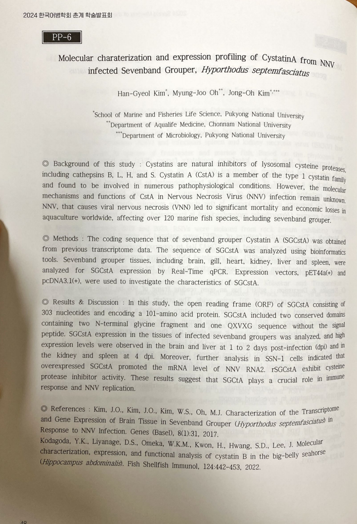 (김종오) 2024년도 한국어병학회_Molecular charaterization and expression profiling of Cystatin A from NNV infected Sevenband Grouper, Hyporthodus septemfasciatus