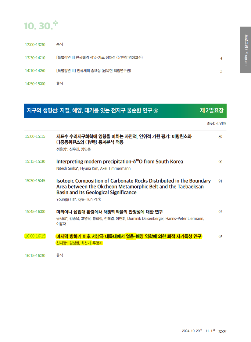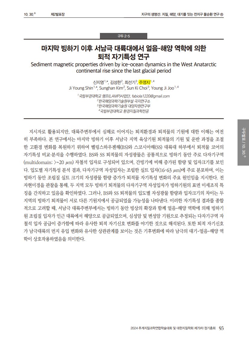 | (주영지) 추계지질과학연합학술대회_마지막 빙하기 이후 서남극 대륙대에서 얼음-해양 역학에 의한 퇴적 자기특성 연구 | |||