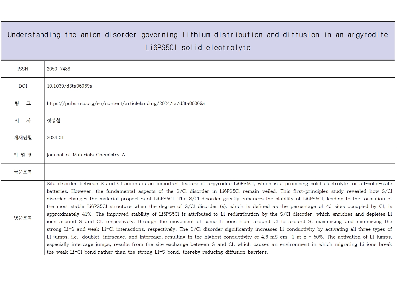 | (정성철) Understanding the anion disorder governing lithium distribution and diffusion in an argyrodite Li6PS5Cl solid electrolyte | |||