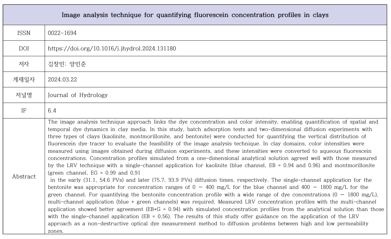 | (양민준) Image Analysis Technique for Quantifying Fluorescein Concentration Profiles in Clays | |||