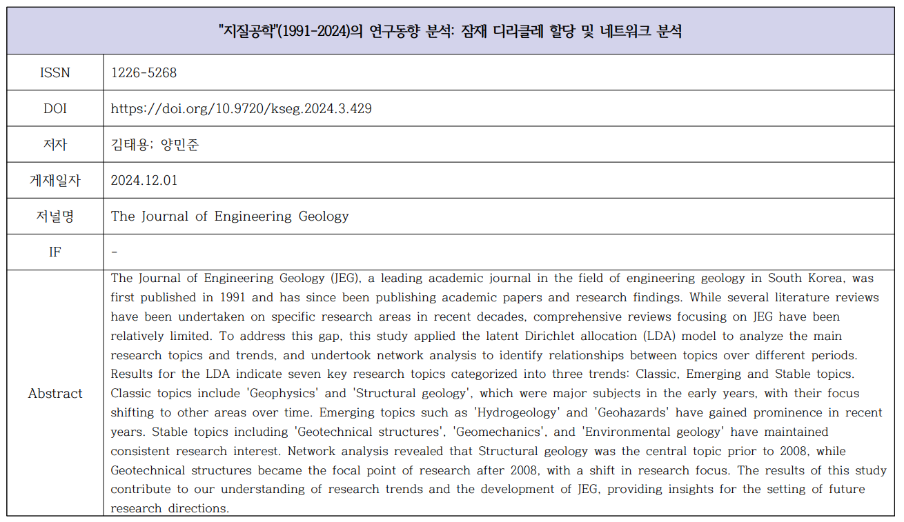 (양민준) "지질공학"(1991-2024)의 연구동향 분석: 잠재 디리클레 할당 및 네트워크 분석