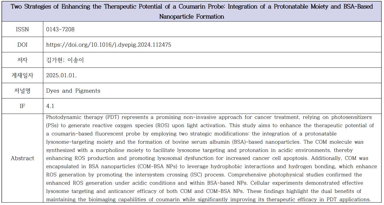 (이송이) Two Strategies of Enhancing the Therapeutic Potential of a Coumarin Probe: Integration of a Protonatable Moiety and BSA-Based Nanoparticle Formation