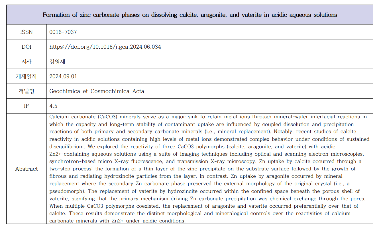 | (김영재) Formation of zinc carbonate phases on dissolving calcite, aragonite, and vaterite in acidic aqueous solutions | |||