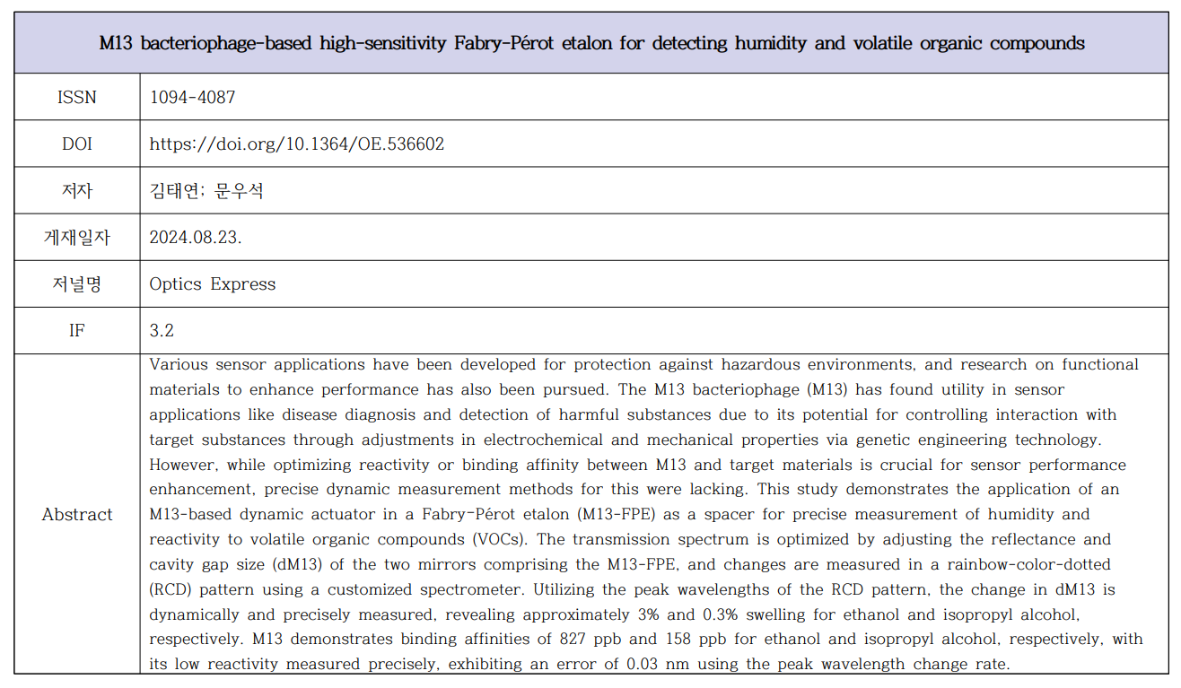 | (김태연; 문우석) M13 bacteriophage-based high-sensitivity Fabry-Perot etalon for detecting humidity and volatile organic compounds | |||