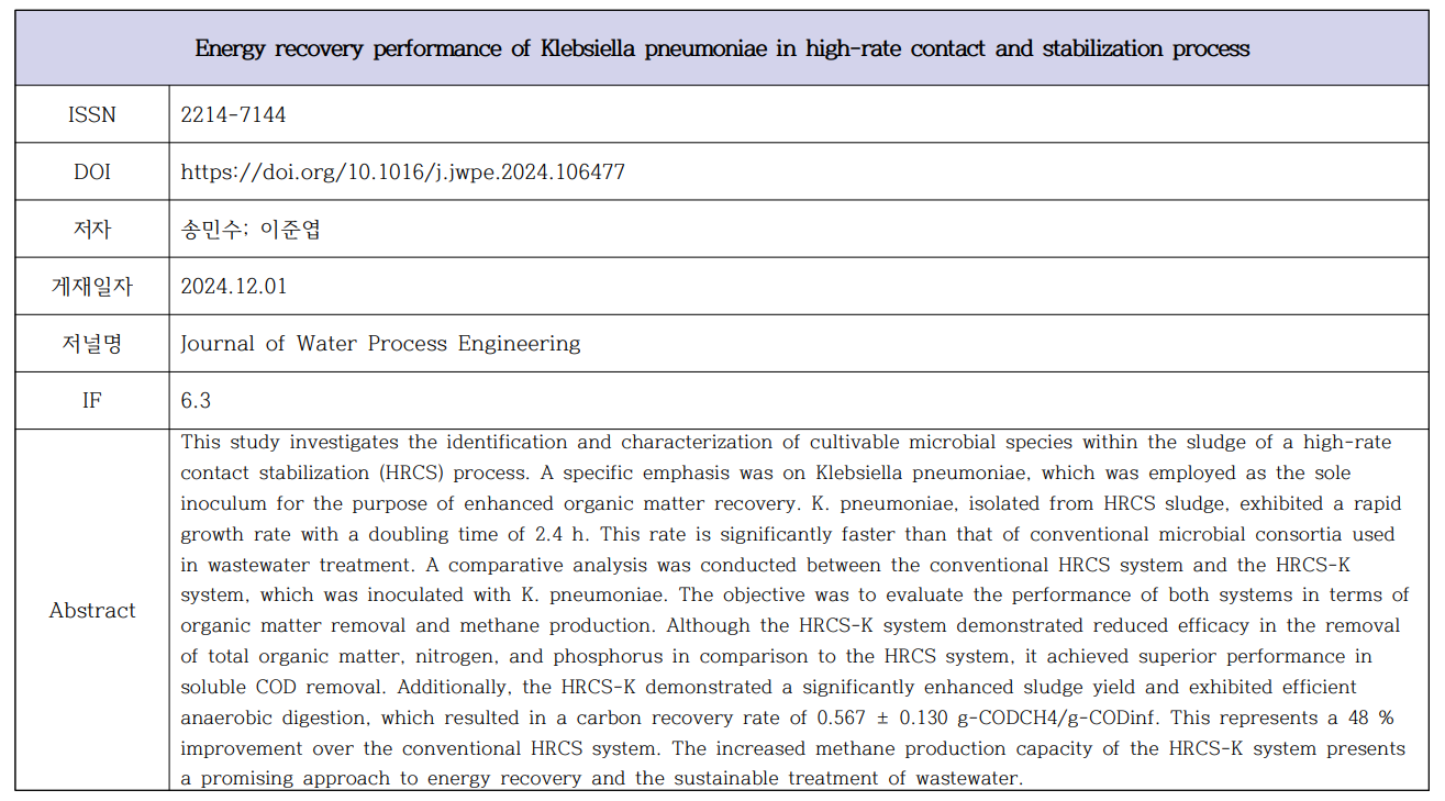 (송민수; 이준엽) Energy recovery performance of Klebsiella pneumoniae in high-rate contact and stabilization process