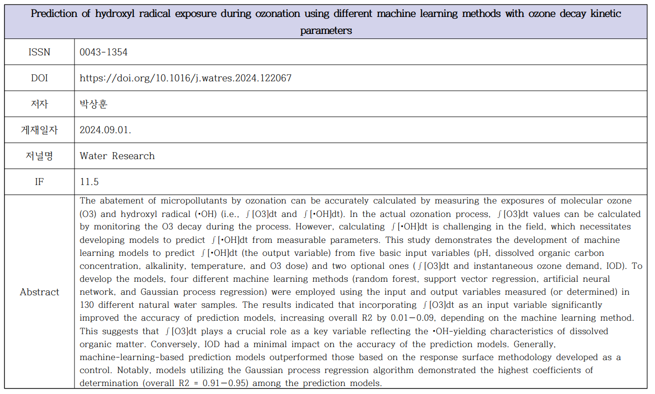 (박상훈) Prediction of hydroxyl radical exposure during ozonation using different machine learning methods with ozone decay kinetic parameters