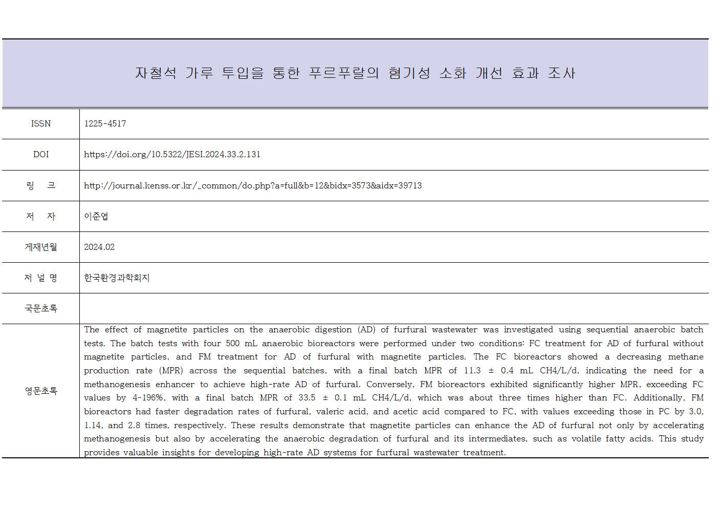 (이준엽) 자철석 가루 투입을 통한 푸르푸랄의 혐기성 소화 개선 효과 조사