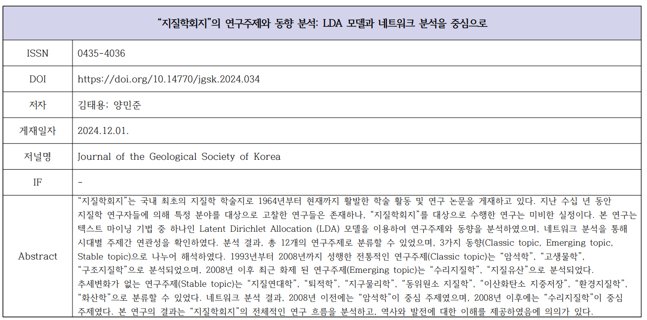 (양민준) “지질학회지”의 연구주제와 동향 분석: LDA 모델과 네트워크 분석을 중심으로