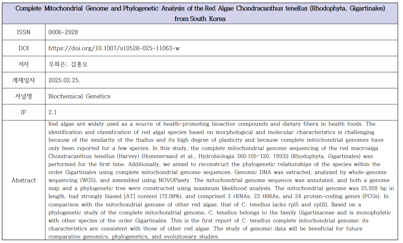 | (우희은; 김종오) Complete Mitochondrial Genome and Phylogenetic Analysis of the Red Algae Chondracanthus tenellus (Rhodophyta, Gigartinales) from South Korea | |||