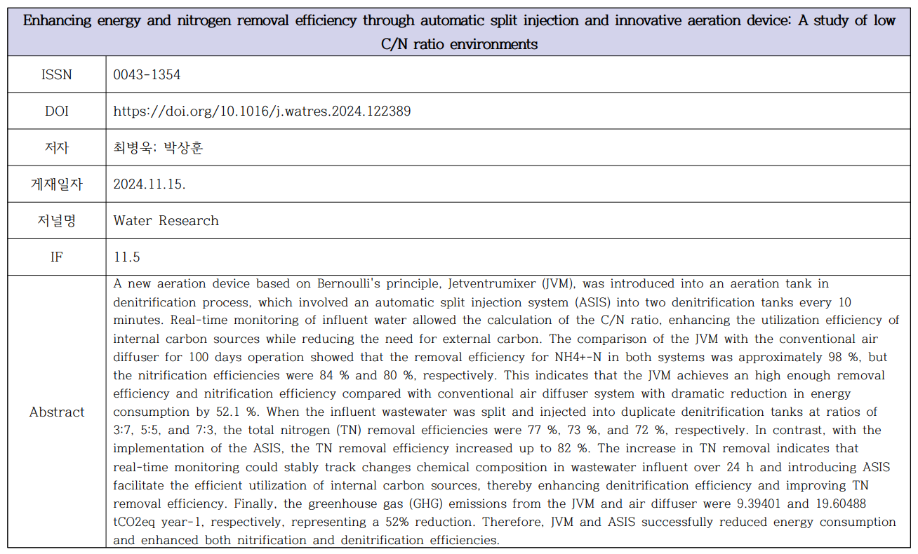 | (최병욱; 박상훈) Enhancing energy and nitrogen removal efficiency through automatic split injection and innovative aeration device: A study of low C/N ratio environments | |||