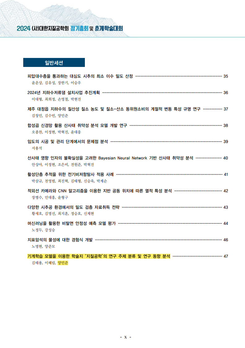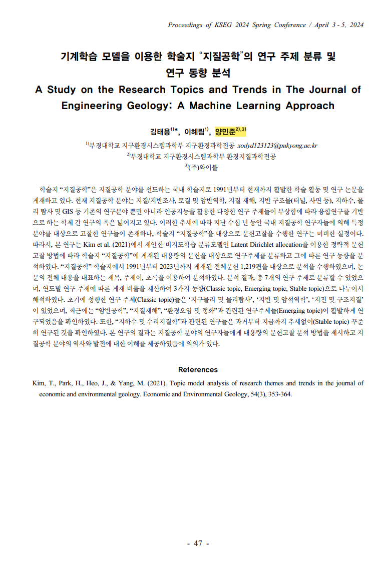 (양민준) 2024 (사)대한지질공학회 정기총회 및 춘계학술대회_기계학습 모델을 이용한 학술지“지질공학”의 연구 주제 분류 및 연구 동향 분석