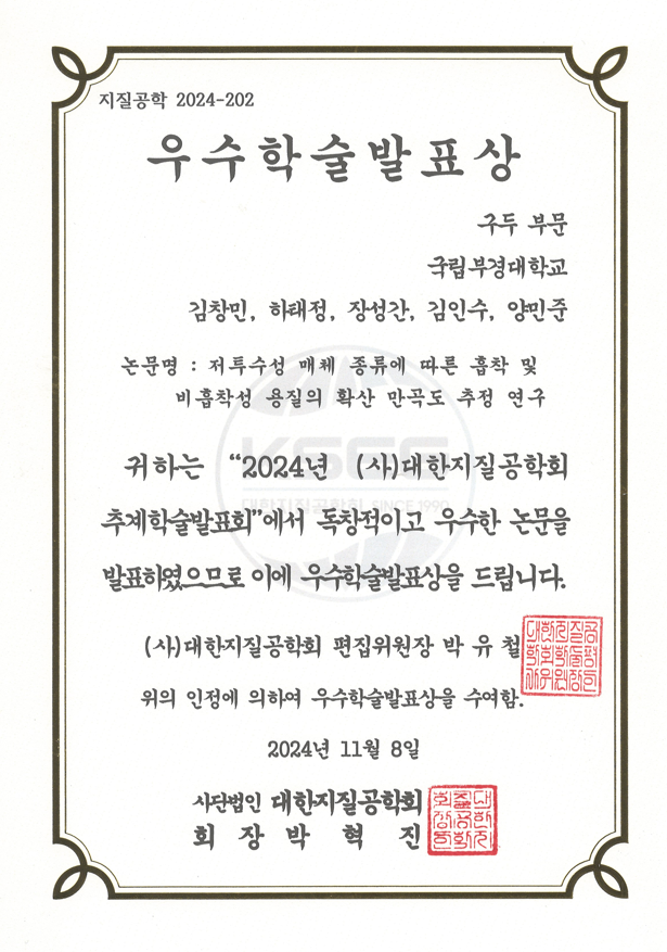 (양민준) 사단법인 대한지질공학회_우수학술발표상(김창민 하태정 장성간)