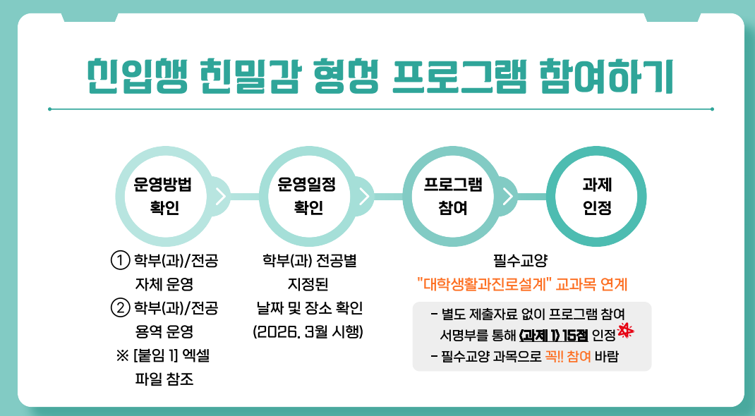 | 첨부파일 | 붙임. 2026학년도 신입생 친밀감 형성프로그램 홍보자료.pdf | ||