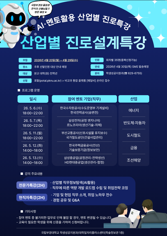 2026년 재학생맞춤형고용서비스사업「진로설계특강(AI·멘토 활용 산업별 진로특강)」안내