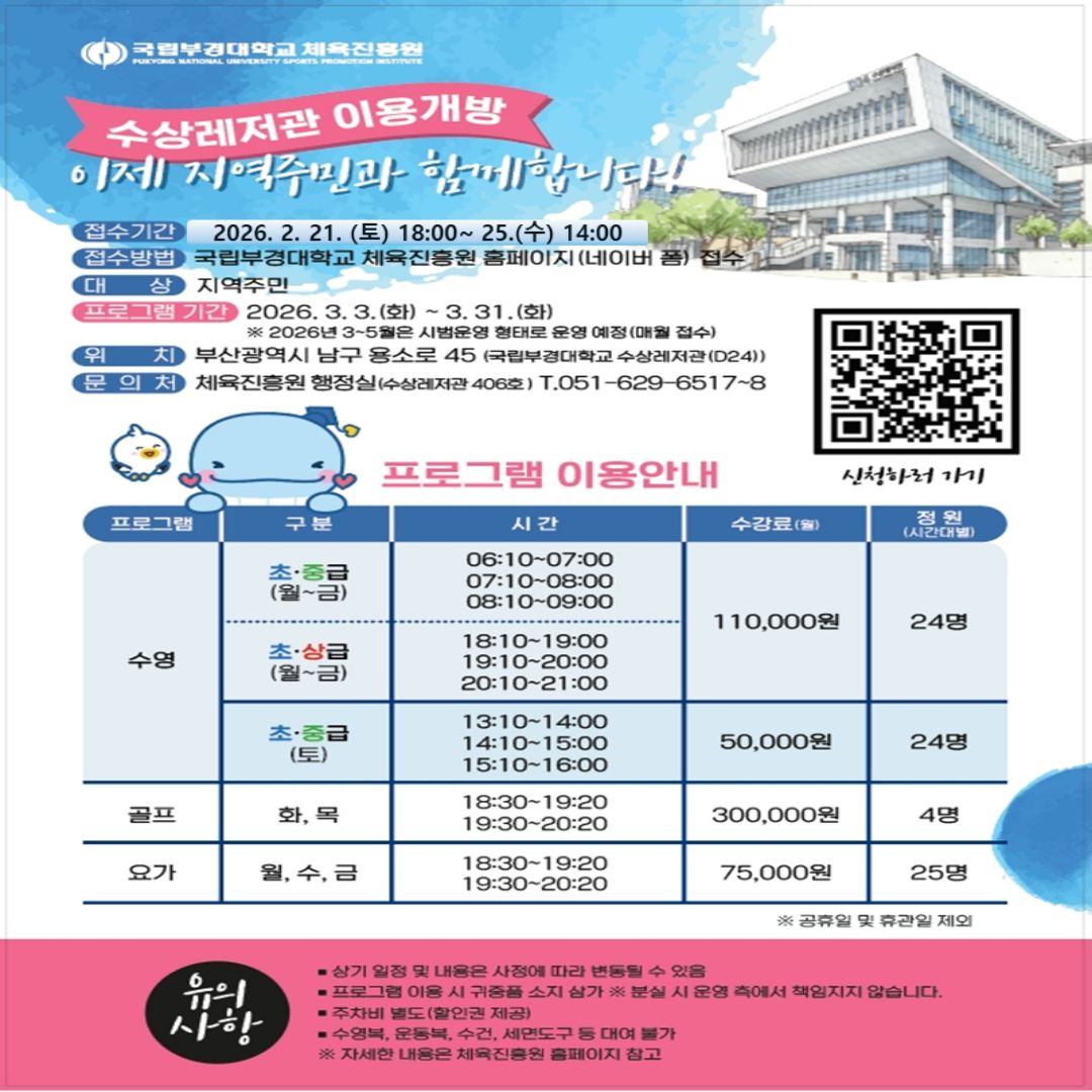 ■ 접수방법 - 접수기간: 2026. 2. 21.(토) 18:00 ~ 2026. 2. 25.(수) 14:00 - 신청서 작성(네이버폼 접수) ※2026. 2. 21. 18:00 오픈 예정 ○ 수영 초급 https://naver.me/5ECTDHGQ ○ 수영 중급 https://naver.me/xqbgt8P6 ○ 수영 상급 https://naver.me/FiPCcADw ○ 골프 레슨 https://naver.me/xYNmJbFn ○ 요가 https://naver.me/Fetcmw8i - 선착순 접수 방식 운영 - 선착순 접수자에 한해 개별 문자(결제 및 입장방법 등) 발송 - 입금 확인 후 최종 등록 완료 ※ 기존회원(학내 구성원) 신청 후 지역주민 접수 예정 ■ 유의사항 - 선착순 대상자에게만 문자 발송 - 기한 내 미입금 시 자동 접수 취소 - 타인 명의 입금 시 사전 연락 필수 ■ 입장방법 - 최종 등록 완료자에 한해서 개별 문자 안내 ■ 문의 - 국립부경대학교 체육진흥원 행정실 ☎051-629-6517~8 ■ 기타사항[필독: 반드시 클릭하여 이용수칙 및 주차 장소를 확인] - 회원 이용 수칙: https://sports.pknu.ac.kr/sports/5069?action=view&no=9983661 - 주차장 안내: https://sports.pknu.ac.kr/sports/5069?action=view&no=9983667 |
