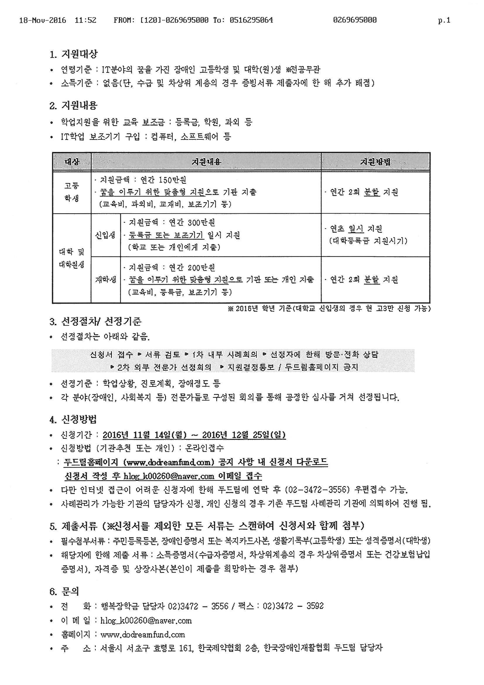 가. 사 업 명 : SK와 함께하는 행복장학금 나. 대 상 : IT분야의 꿈을 가진 장애인 고등학생 및 대학(원)생 *전공무관 다. 지원내용 : 학업 지원을 위한 교육 보조금(등록금, 학원 과외비 등) 및 IT 학업보조기기 라. 모집기간 : 2016. 11. 14(월) ~ 12.25(일) (약 5 주 간) 마. 신청방법 : 신청서 제출 (www.dodreamfund.com 공지사항 참고) 바. 문 의 : 한국장애인재활협회 행복장학금 담당자(02-3472-3556) |